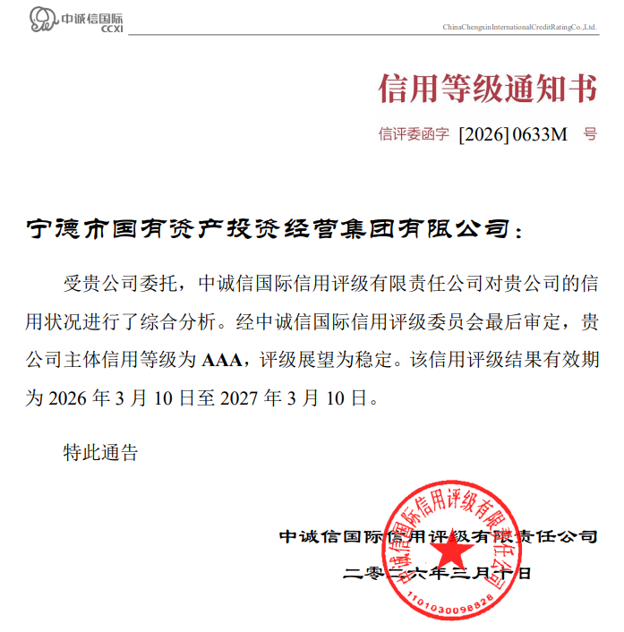 双AAA信用评级通知书