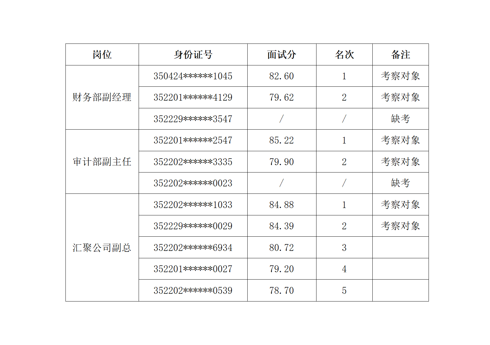 根据《中层管理人员竞争上岗方案》及相关要求,现将考生面试成绩向予以公示。根据面试成绩从高到低,按2:1的比例确定考察对象。